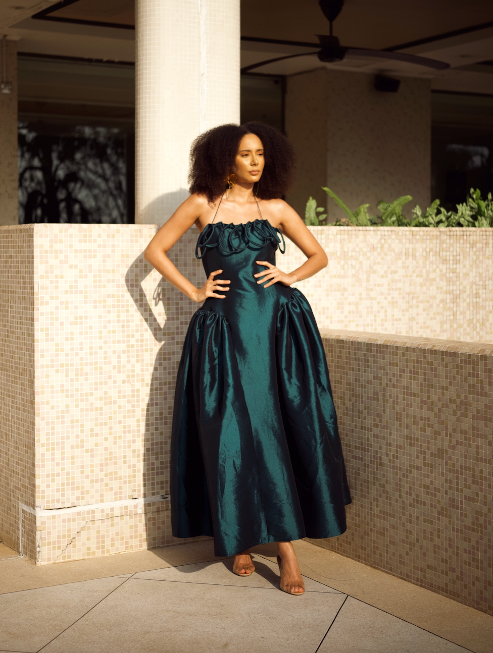 Meraki is a feminine and fun dress crafted from Taffeta. Features a fitted bodice, signature oval details at the chest, back zipper, elasticated alter-neck, and gathered to hem.