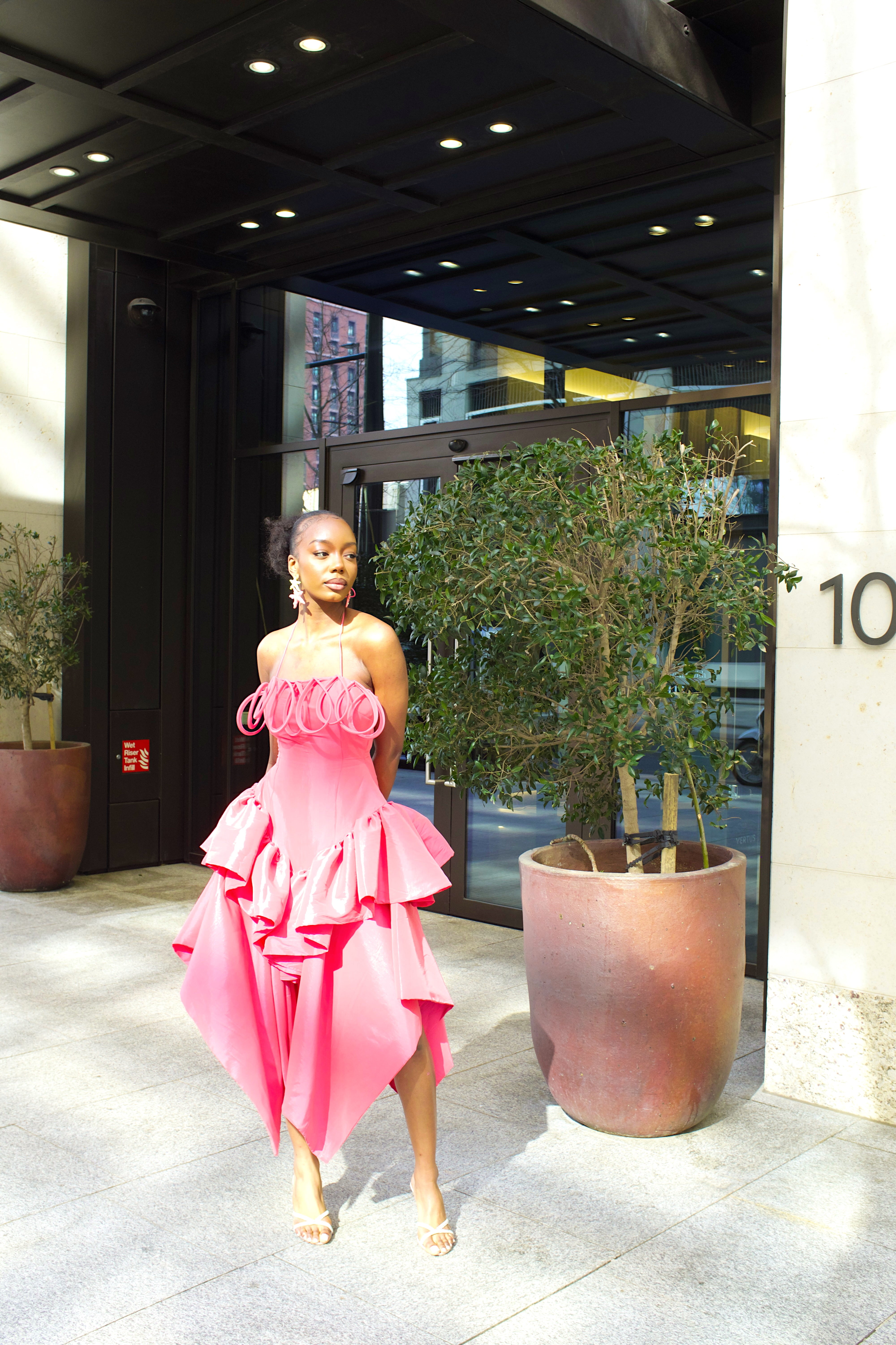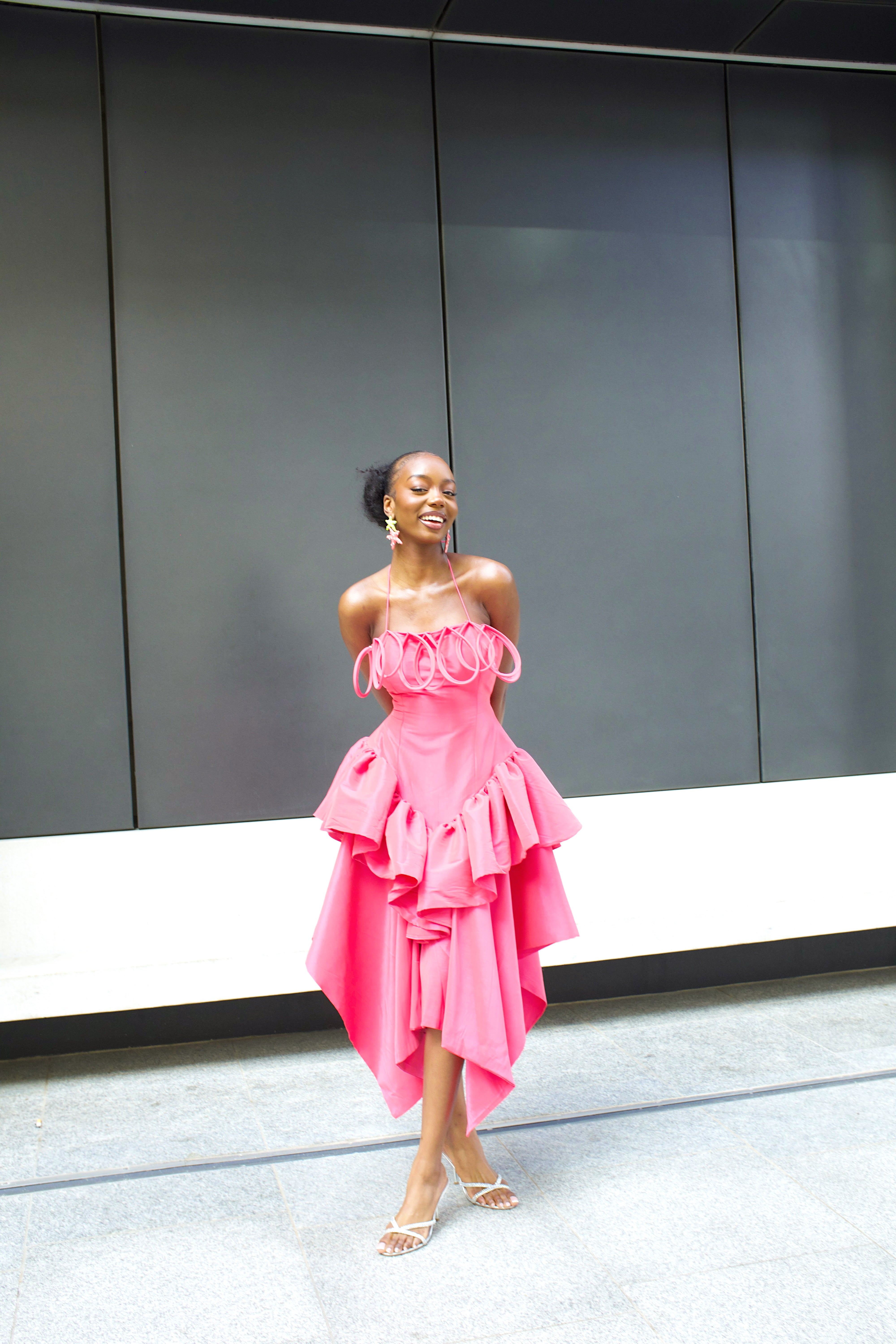 Kyriake is a feminine and functional dress crafted from Taffeta. Features a fitted bodice, back zipper, elasticated alter-neck, oval detailing at the chest, and asymmetrical layers to hem.
