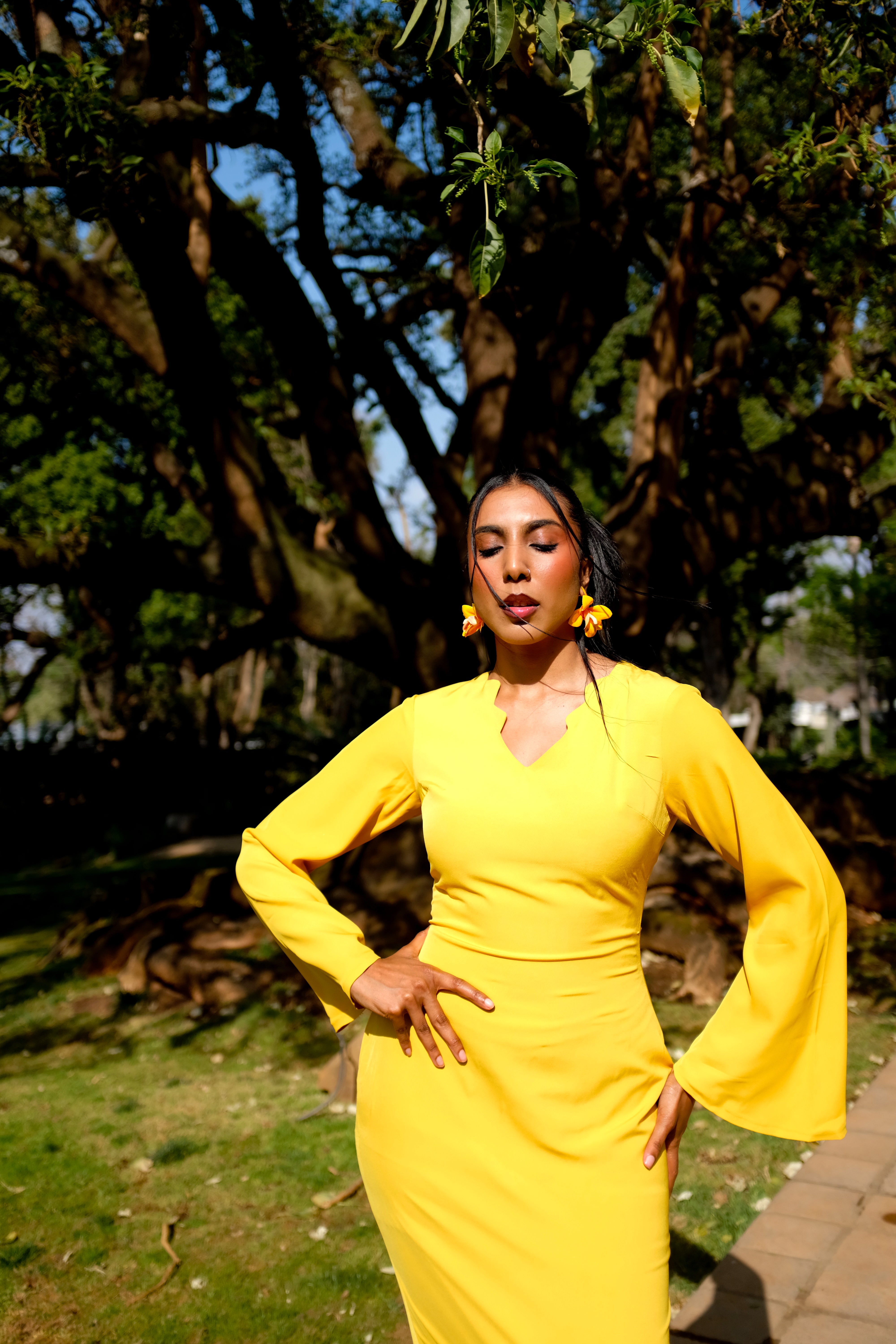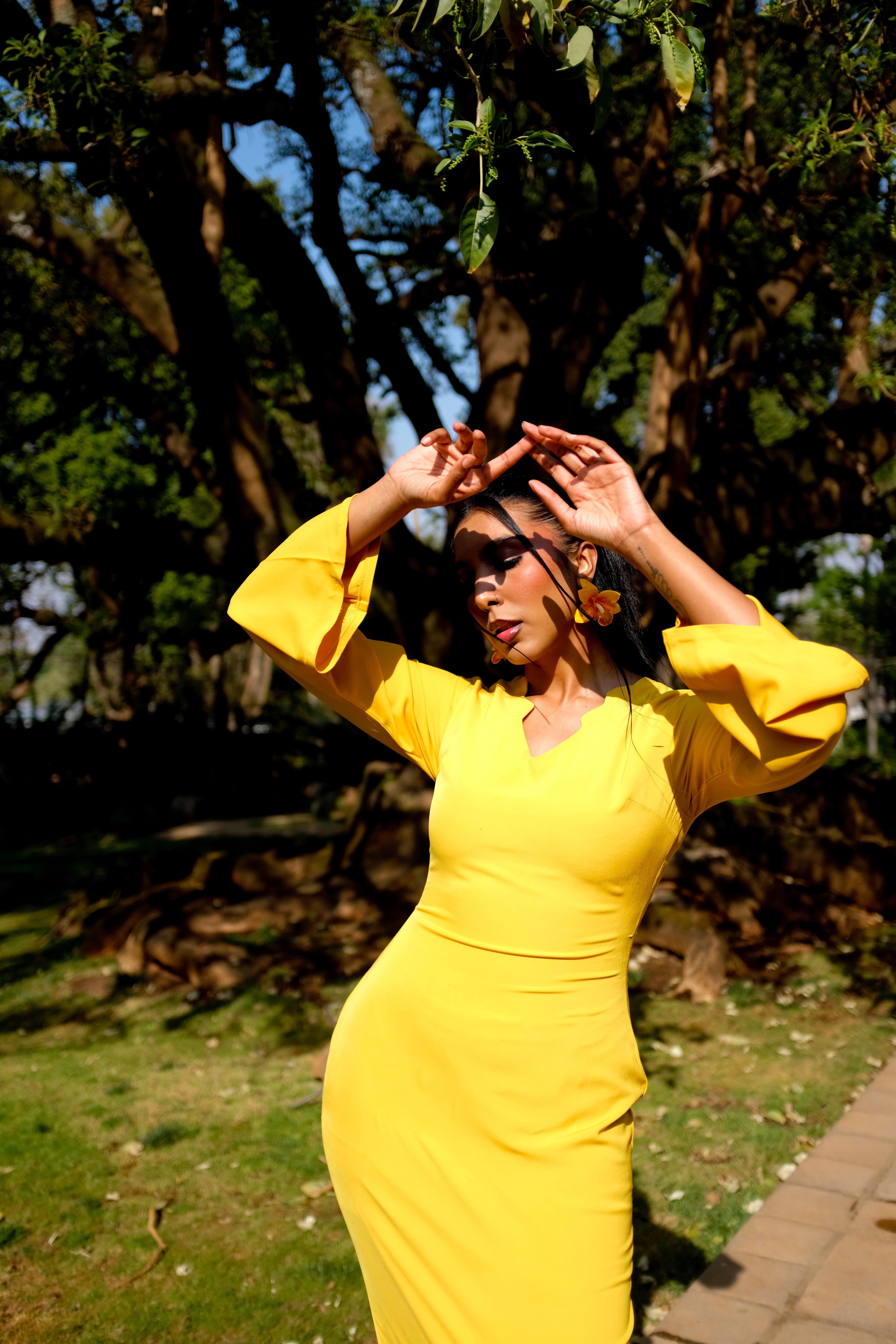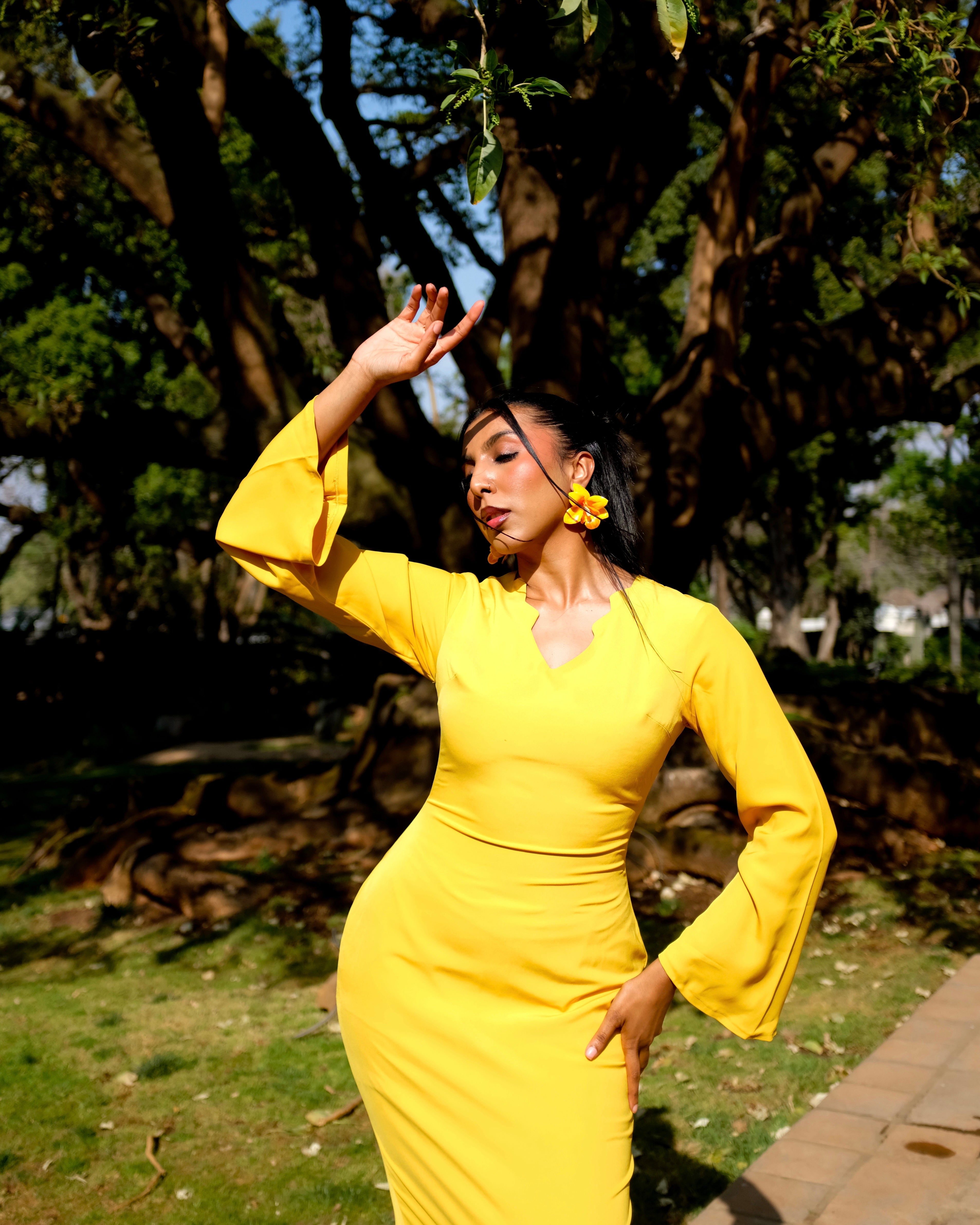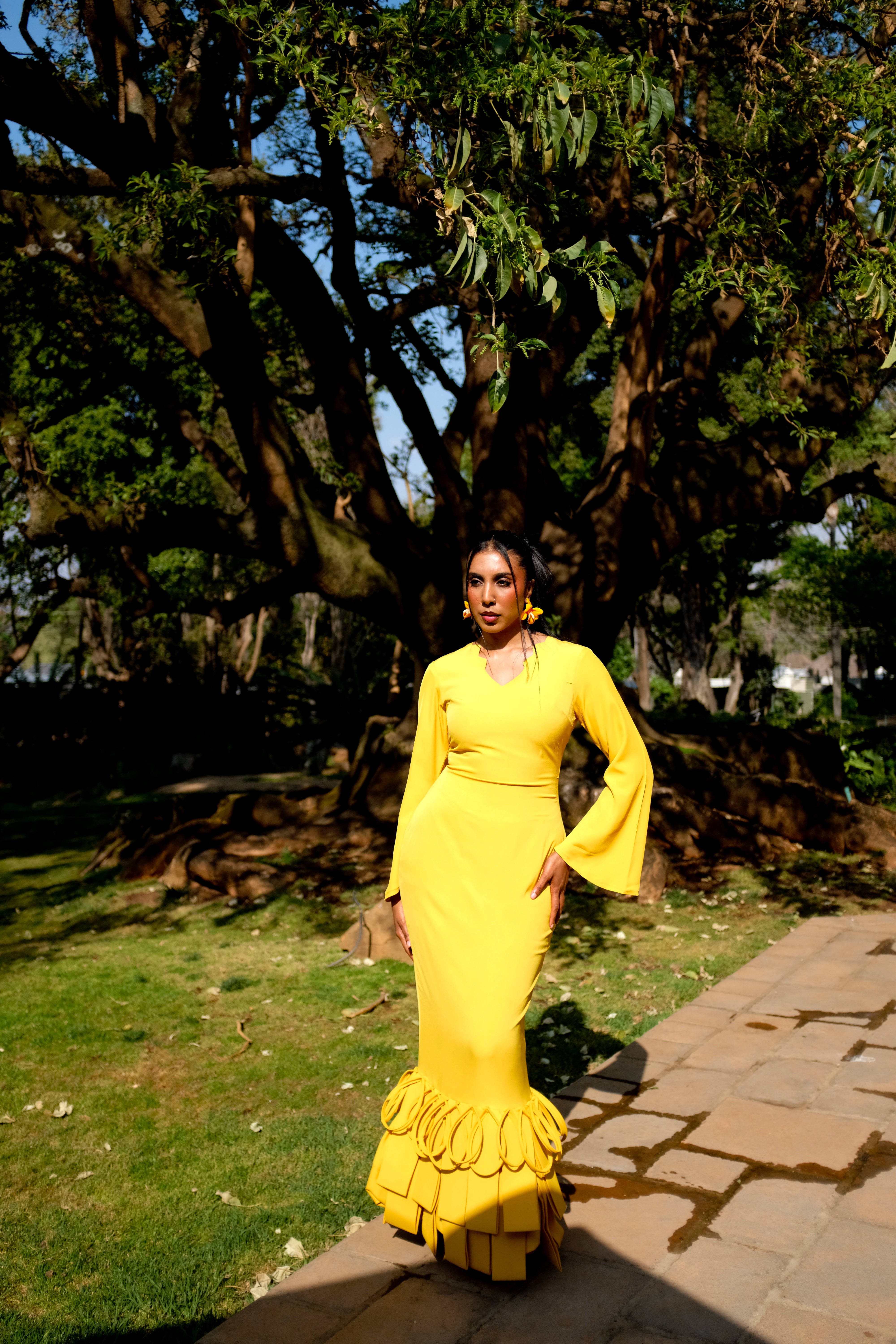 Lumera is a feminine and functional maxi dress crafted from Crepe. Features a fitted bodice, back invisible zipper, curved v-neckline, back slit, and gathered puffy flare at hem, with asymmetrical ovals and flaps.