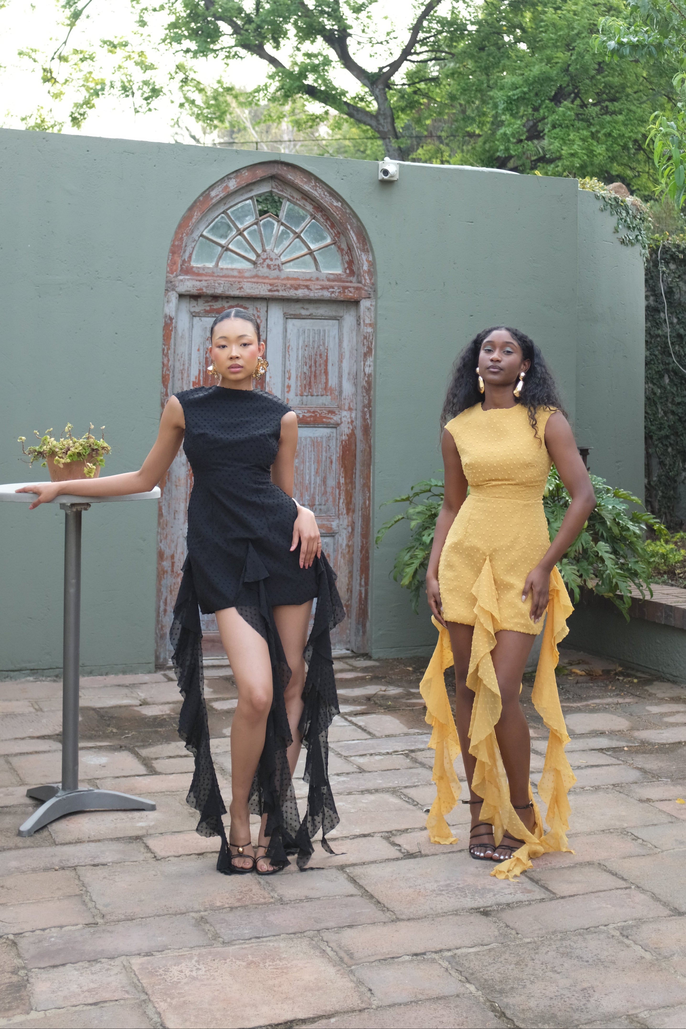 Jehlani is a feminine and fun dress crafted from Chiffon. Features a fitted bodice, high round neck, cap sleeves, back invisible zip, and asymmetrical flounces from the hip to hem.