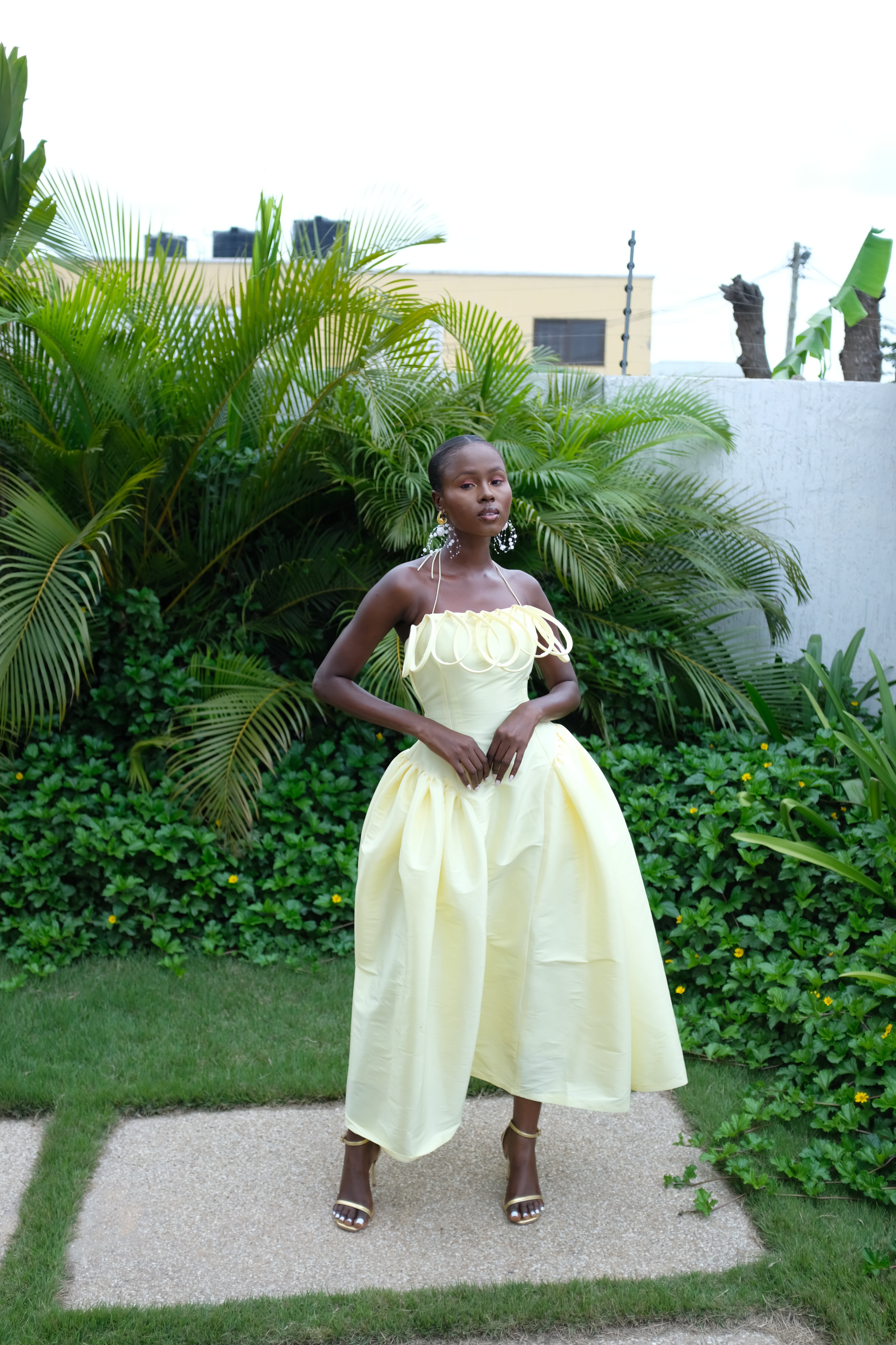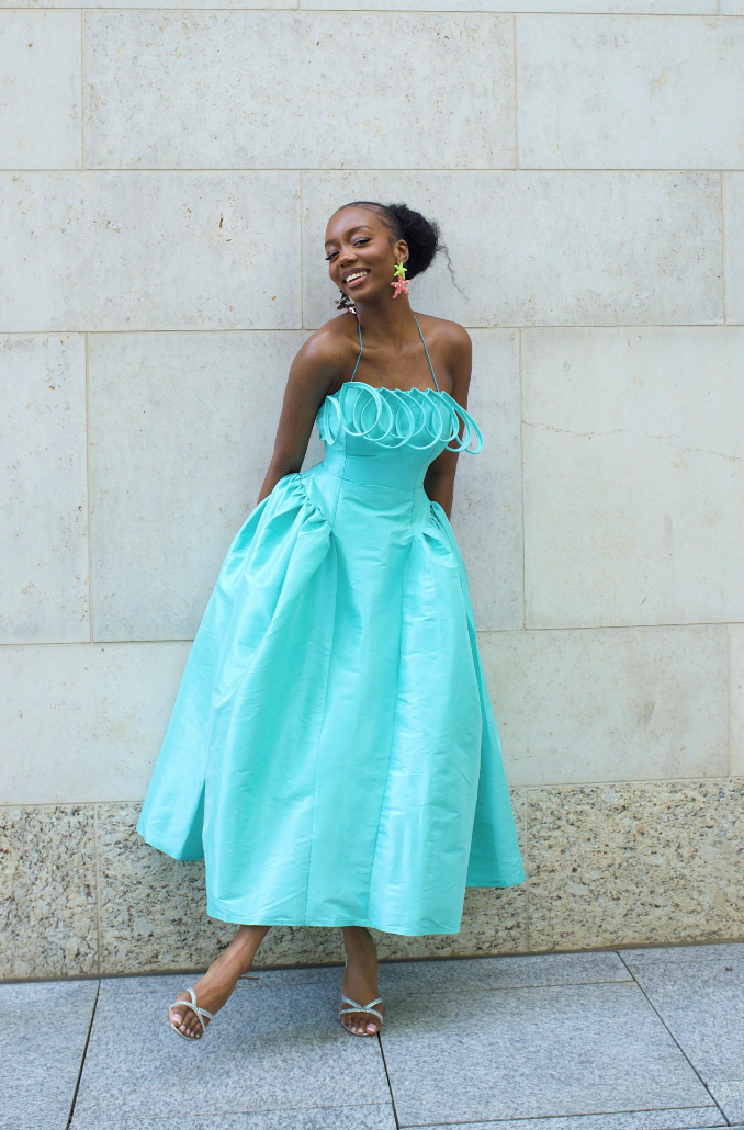 Meraki is a feminine and fun dress crafted from Taffeta. Features a fitted bodice, signature oval details at the chest, back zipper, elasticated alter-neck, and gathered to hem.